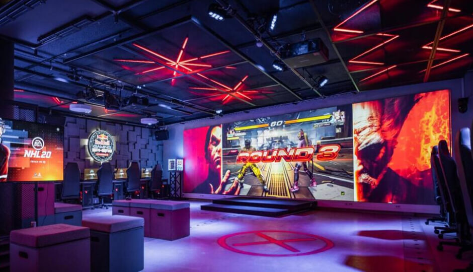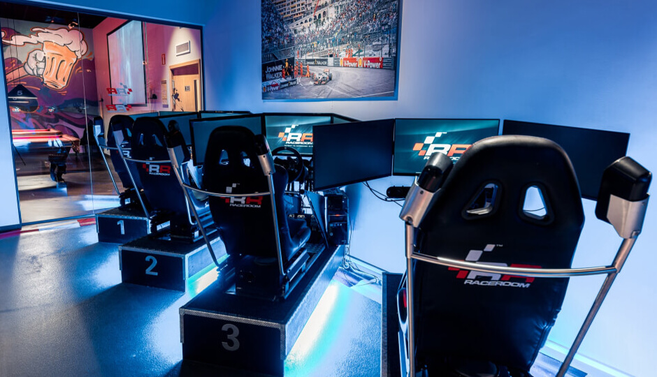 Modern gaminglounge med PS5, PC, VR och racing-simulatorer i e-sportmiljö.