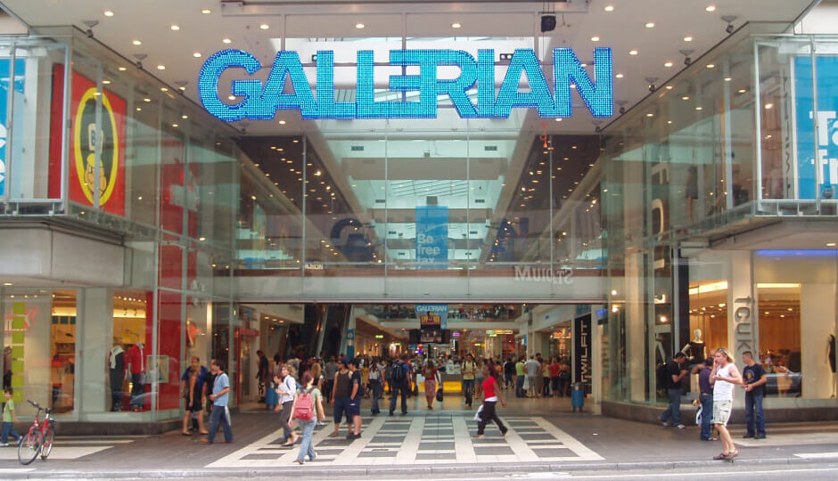 Stockholms klassiska galleria vid T-centralen med butiker, caféer och cityutsikt.